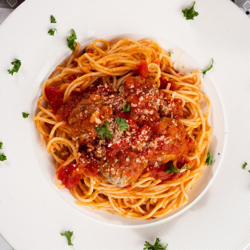 Spaghetti pasta, marinara, sliced sausage, meat sauce, meatballs, and mushrooms