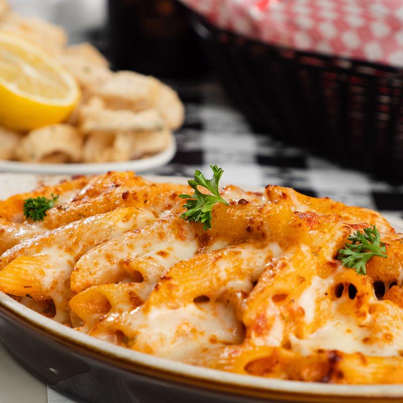 Ziti pasta baked with ricotta and marinara sauce topped with mozzarella cheese