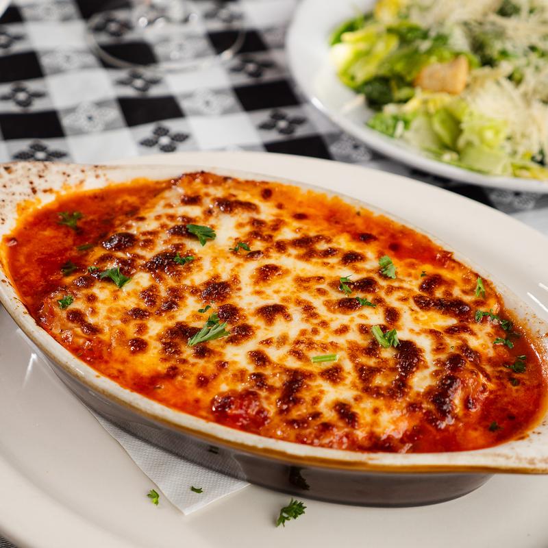 Pasta sheets, ground beef, ricotta, and mozzarella cheese baked in marinara sauce and topped with mozzarella cheese