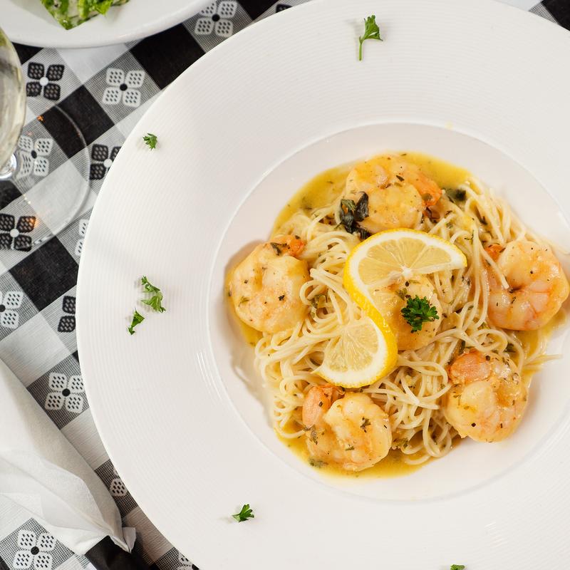 Shrimp, fresh basil, sautéed in white wine and lemon sauce over angel hair pasta
