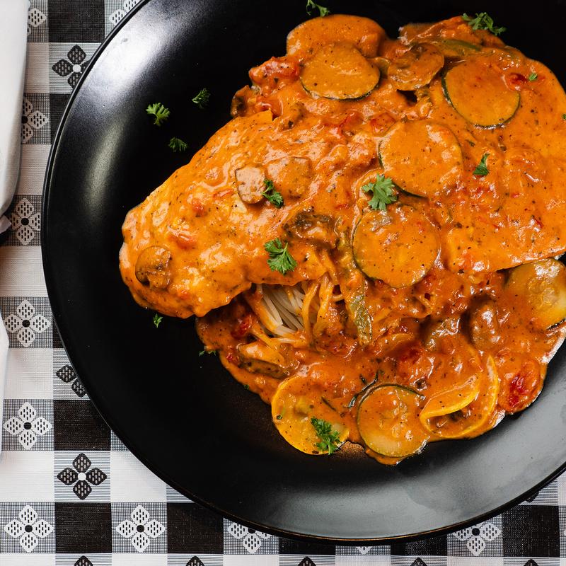 Chicken, zucchini, squash, bell peppers, mushrooms, sautéed in sherry wine and pink sauce over spaghetti pasta