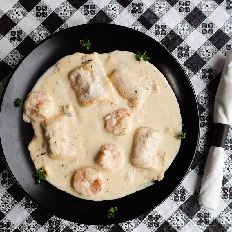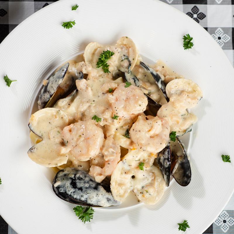 Shrimp, lobster ravioli pasta sautéed in white wine and alfredo sauce