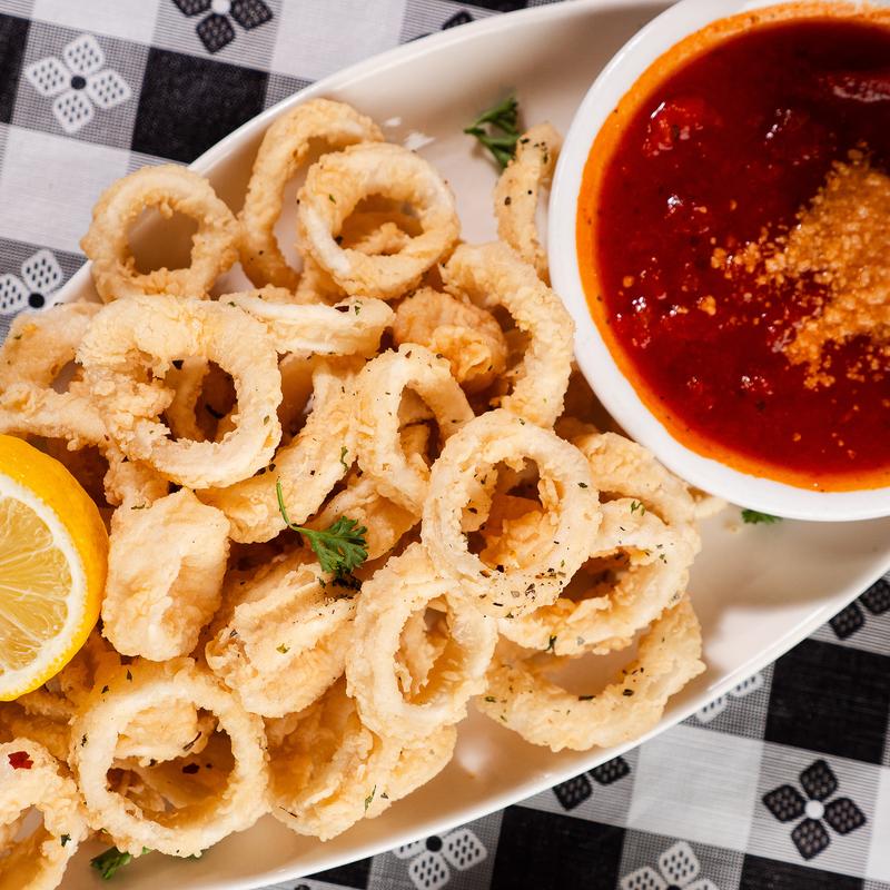 Shrimp, salmon, scallops, calamari, mussels, clams, chopped clams sautéed in white wine and spicy marinara sauce over linguini pasta