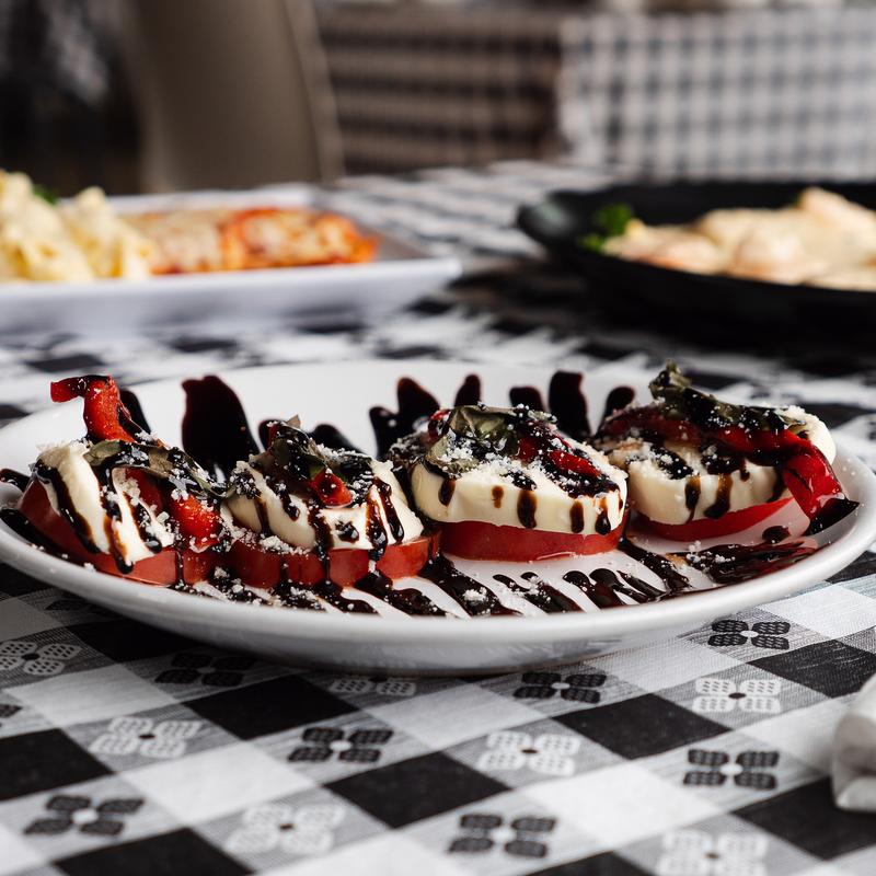 Mozzarella cheese, tomatoes, basil, roasted peppers, seasoning, balsamic vinegar