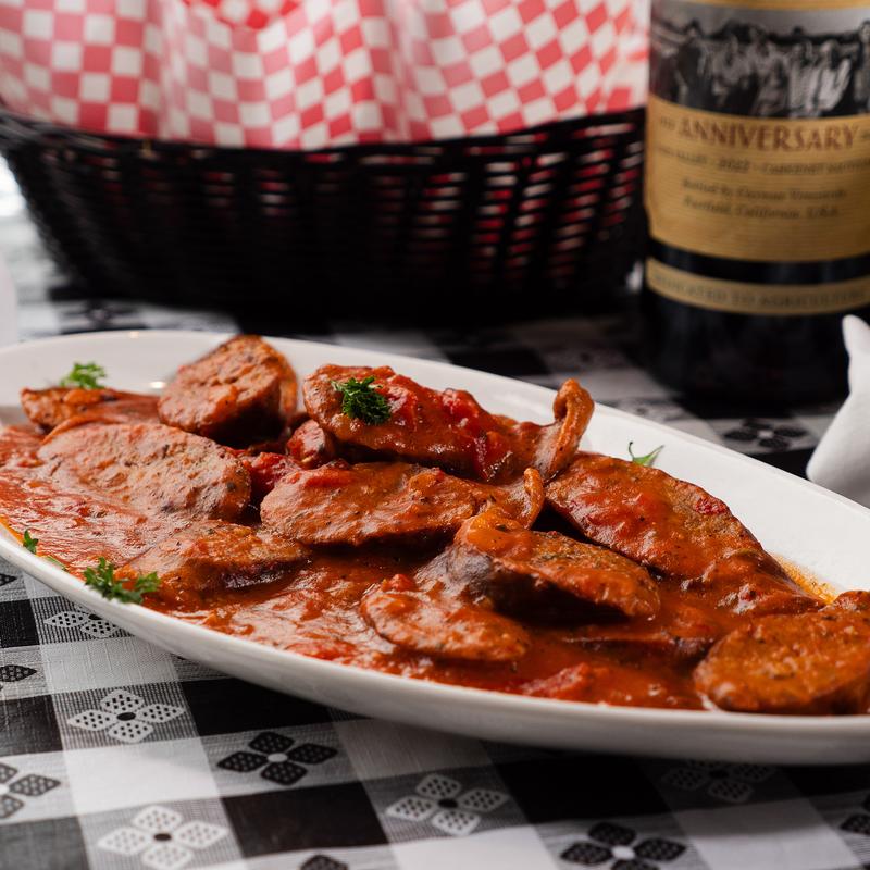 Chicken, bell peppers, onions, and mushrooms sautéed in white wine and marinara sauce