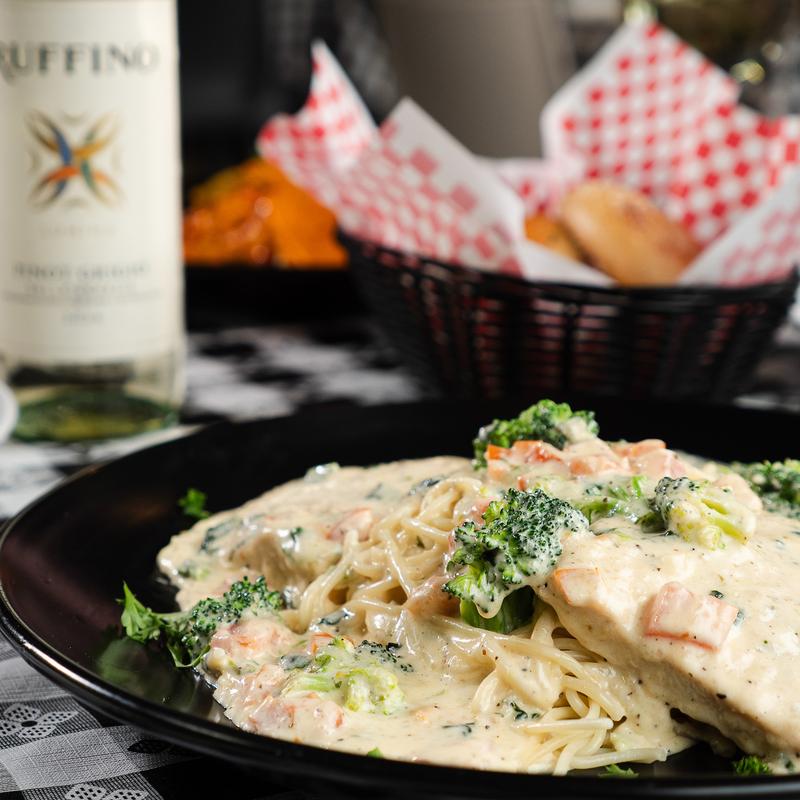Chicken breast sautéed in white wine and creamy sauce over fettuccine pasta
